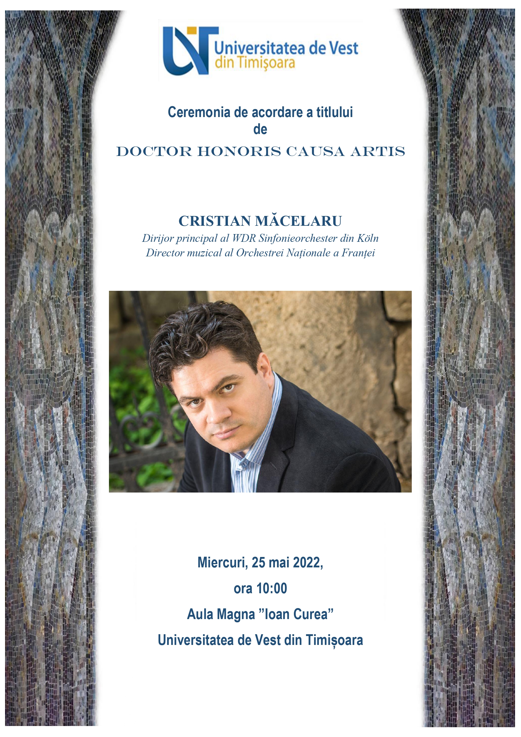 Pe lângă aceste activități interactive, programul zilei de 25 mai 2022 mai include și un moment ceremonial care onorează întreaga comunitate academică a UVT, când titlul de Doctor Honoris Causa Artis va fi acordat maestrului Cristian Măcelaru, ambasador cultural al României în plan internațional, în prezent director muzical al Orchestrei Naționale a Franței și Dirijor principal al WDR Sinfonieorchester din Köln. Ceremonia acordării titlului de Doctor Honoris Causa Artis a Universității de Vest din Timișoara maestrului Cristian Măcelaru va avea loc în Aula Magna „Ioan Curea” a UVT, situată la etajul întâi, sediul principal UVT (V.Pârvan nr 4), miercuri, 25 mai 2022, începând de la ora 10.