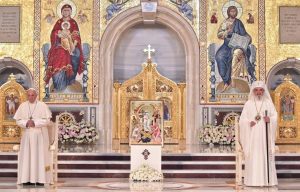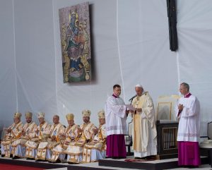 La Blaj, în cadrul primei Sfinte Liturghii pontificate de Sanctitatea Sa în ritul bizantin, Papa Francisc a adus un omagiu martirilor credinței din perioada regimului comunist, prin solemnul act al beatificării celor șapte episcopi greco-catolici români: Valeriu Traian Frențiu, Vasile Aftenie, Ioan Suciu, Tit Liviu Chinezu, Ioan Bălan, Alexandru Rusu și Iuliu Hossu. Preocuparea sa constantă pentru situația migranților a reprezentat una dintre direcțiile esențiale ale pontificatului său, reflectând atenția profundă acordată dimensiunii sociale a misiunii Bisericii.