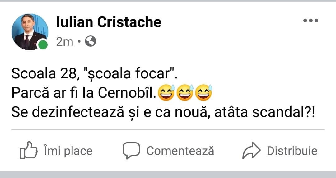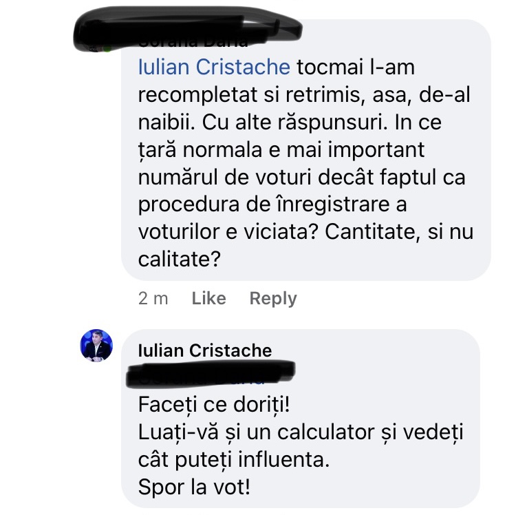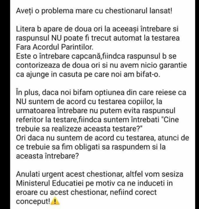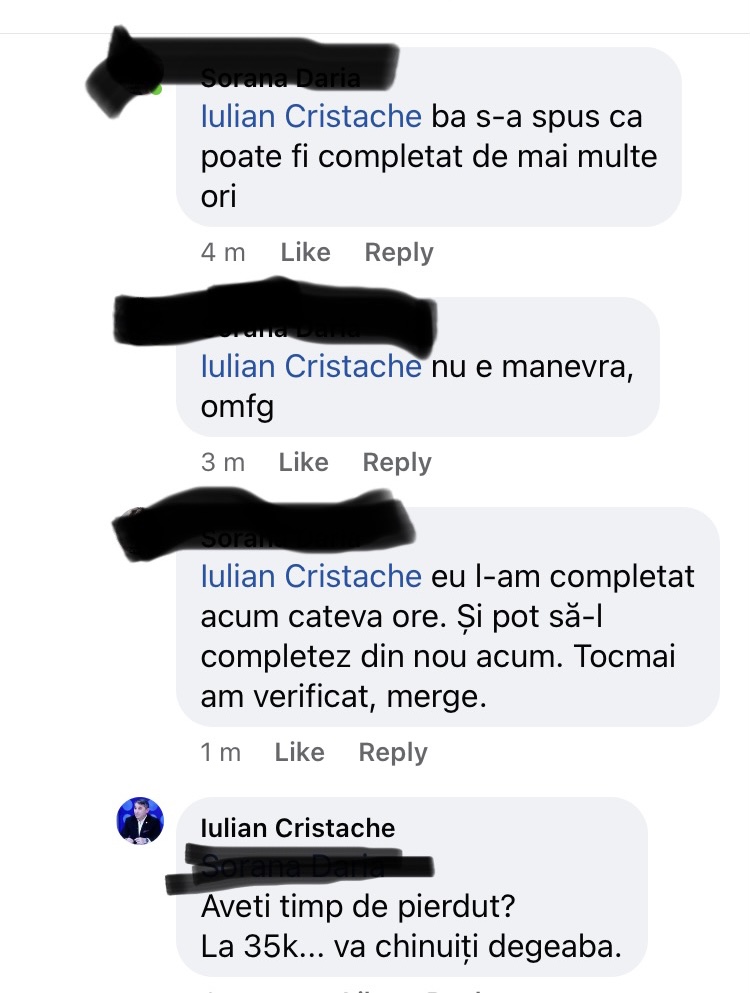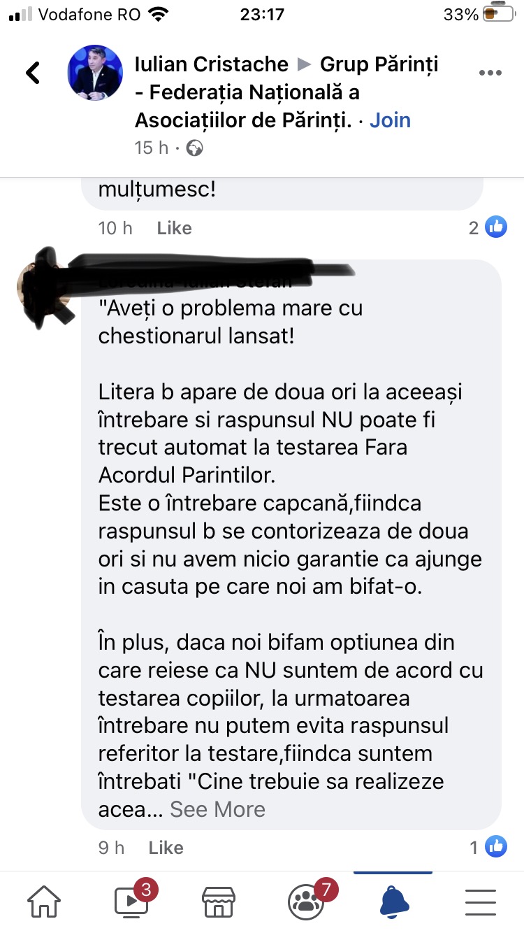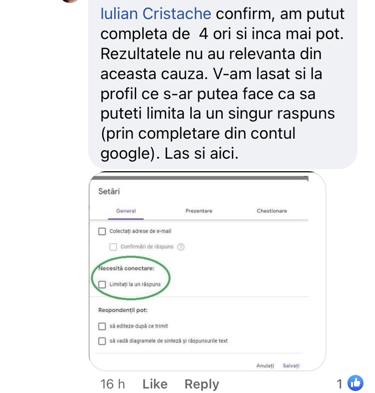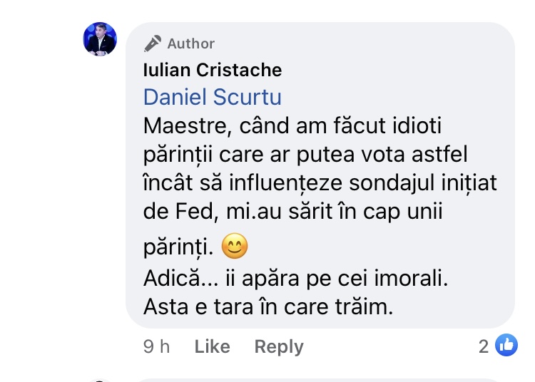 putut fi completat de oricine de oricâte ori dorește. După nenumăratele sesizări, au modificat și se putea răspunde doar pe baza autentificării cu un cont. Așa cum este normal. Acest lucru s-a întâmplat după 35.000 de răspunsuri, adică jumătate din cei care au răspuns. Domnul Iulian Cristache nu a avut nicio problemă cu acest aspect, se adresează urât părinților, îi blochează și ia totul în glumă. În același timp, vă semnalez faptul că sondajul a avut o serie de erori metodologice, care fac rezultatul cel puțin discutabil. Tot ceea ce semnalez se poate observa din pozele și video-ul atașat.”