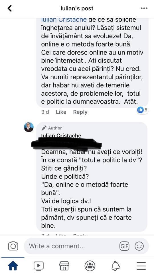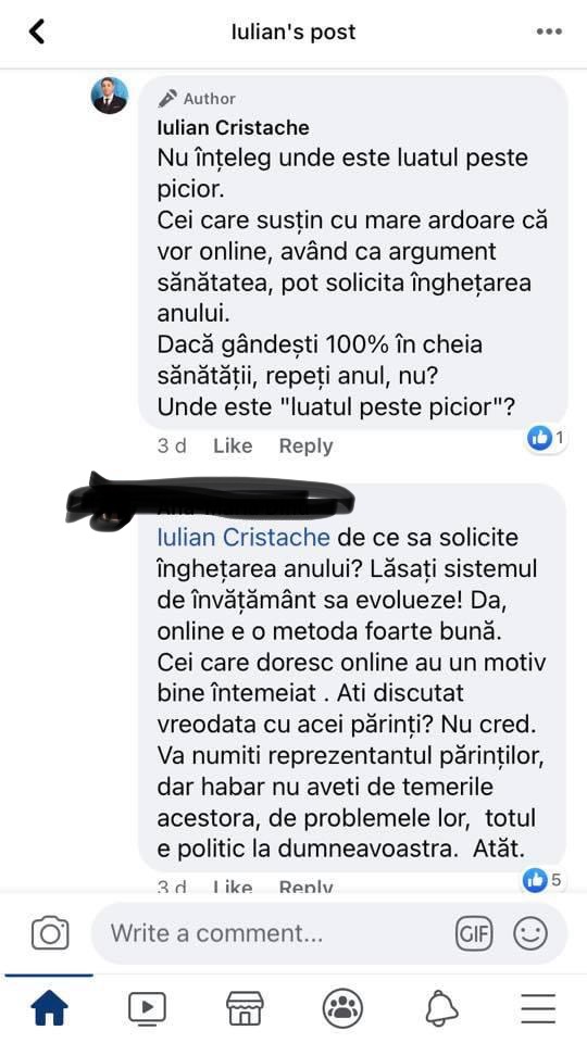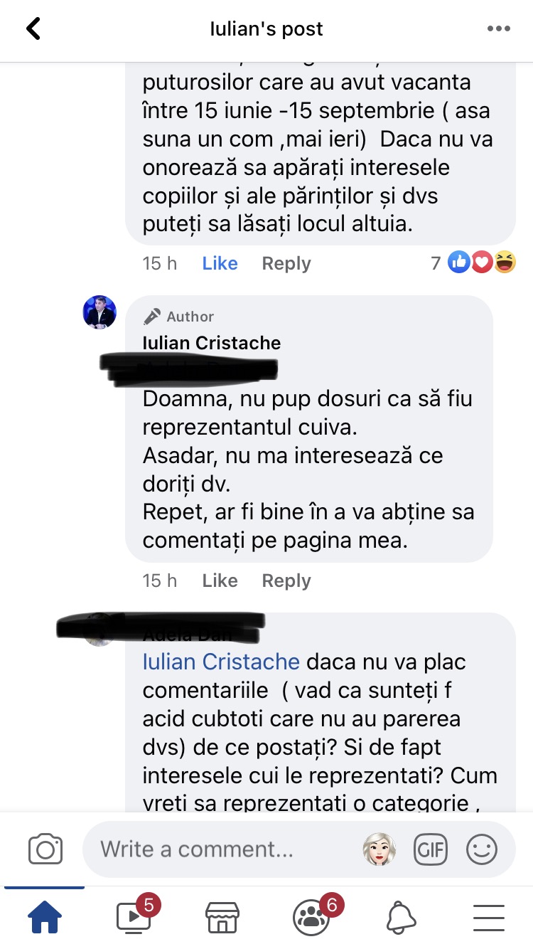 Domnule ministru din acest conflict , artificial creat marii perdanți sunt copiii. Vă asumați răspunderea pentru acest fapt? Acesta este omul pe care îl invitați la discuții esențiale pentru școala românească? Nu cred că nu aveți un consilier care să urmărească activitatea pe grupurile de părinți și profesori. Și, de fapt, de când este Facebook barometrul care măsoară societatea și nevoile ei? De când este Facebook-ul plin de conturi false dirijorul care dă tonul școlii românești?