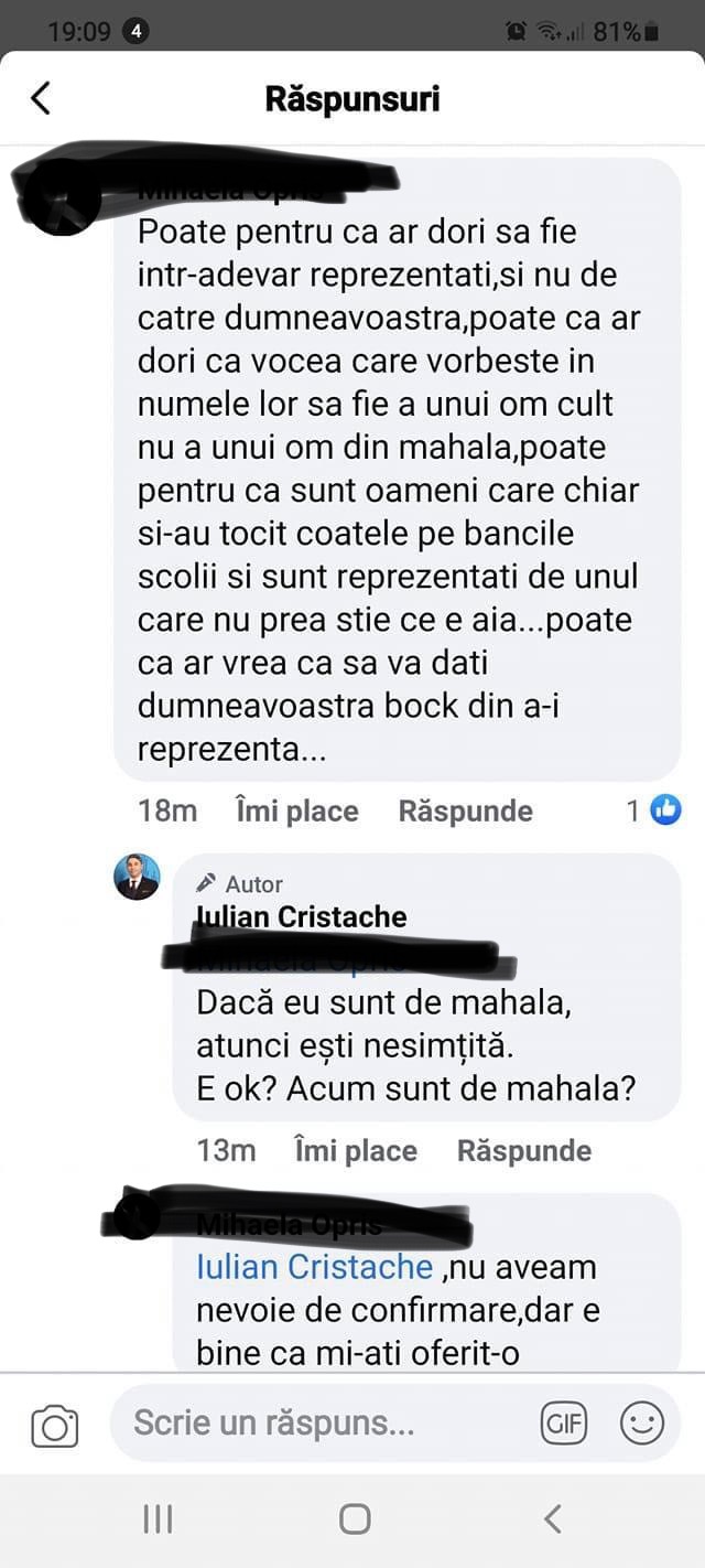 Unul din mesaje este foarte vehement și argumentat, inclusiv cu print screen-uri. A. B. spune în mesaj, citez: