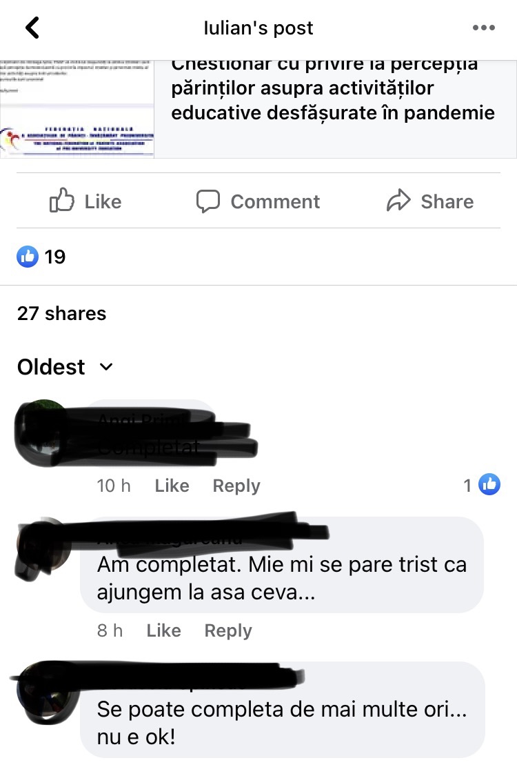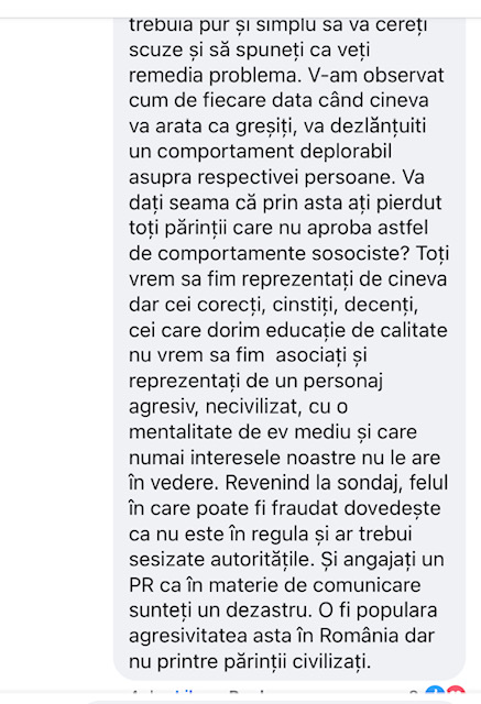 Mie mi se pare periculos faptul că ministerul ia de bune aceste sondaje. Îmi este greu să cred că nu are un consilier care urmărește aceste grupuri și nu știe despre ce este vorba. Nu se poate ca în calitate de ministru al educației să ai că partener în Comisia de dialog social un părinte care spune despre alți părinți “Maestre când am făcut idioți părinții care ar putea vota astfel încât să influențeze sondajul inițiat de Fed, mi.au sărit în cap unii părinți.”