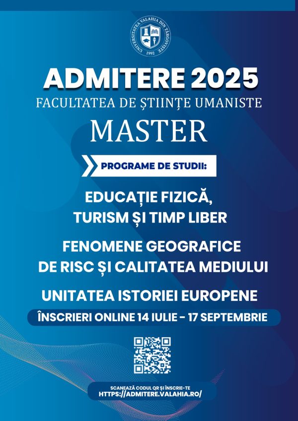 Facultatea de Științe Umaniste, din cadrul Universității „Valahia” din Târgoviște organizează o nouă sesiune de admitere pentru anul universitar 2025-2026, oferind încă o oportunitate de înscriere pentru candidații care doresc să urmeze programele de studii universitare de licență și masterat.