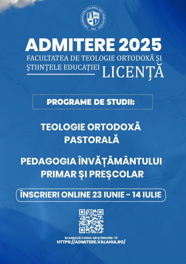 Facultatea de Teologie Ortodoxă și Științele Educației, din cadrul Universității „Valahia” din Târgoviște organizează o nouă sesiune de admitere pentru anul universitar 2025-2026, oferind încă o oportunitate de înscriere pentru candidații care doresc să urmeze programele de studii universitare de licență și masterat.