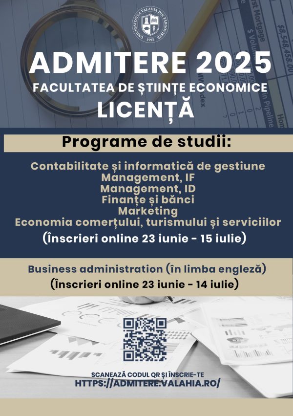 Facultatea de Științe Economice din cadrul Universității „Valahia” din Târgoviște organizează o nouă sesiune de admitere pentru anul universitar 2025-2026, oferind încă o oportunitate de înscriere pentru candidații care doresc să urmeze programele de studii universitare de licență și masterat.