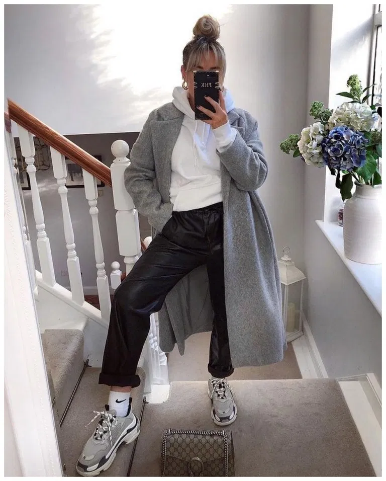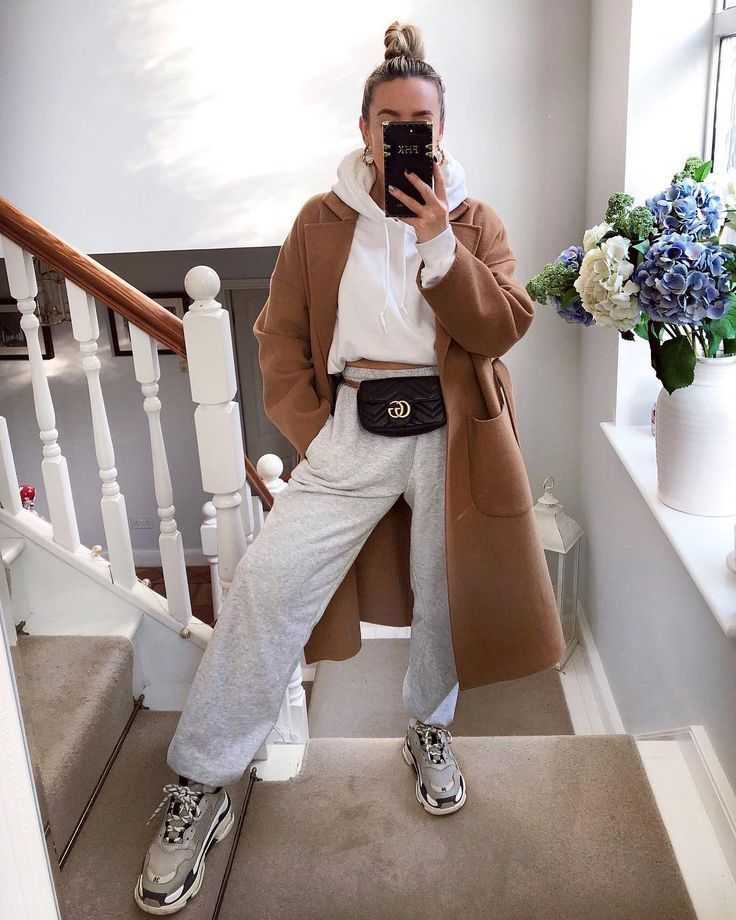- Persoanele care își doresc să păstreze stilul sport, dar să arate totuși diferit, pot transforma, cu ușurință, ținuta într-una casual. De exemplu, un hanorac alb se va potrivi de minune cu o pereche de pantaloni largi în aceeași culoare sau negri, o pereche de adidași, un palton lung și, poate, o borsetă prinsă în talie.