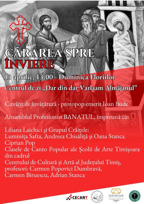 Centrul de Cultură și Artă al Județului Timiș în parteneriat cu Centrul de Zi ”Dar din dar Varlaam Almăjanu” și Mănăstirea Sf. Iosif cel Nou de la Partoș vă invită în 13 aprilie 2025, în Duminica Floriilor, de la ora 13:00, la spectacolul ”Cărarea spre Înviere.”