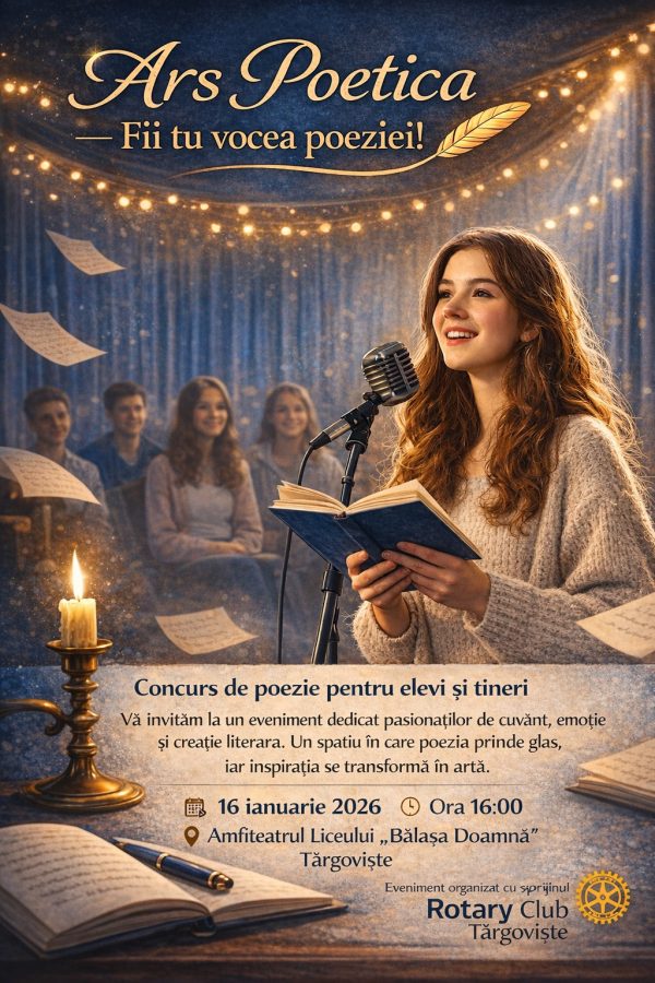 Ars Poetica – Fii tu vocea poeziei! Rotary Club Târgoviște vă invită cu drag la un eveniment special dedicat elevilor și tinerilor care iubesc poezia, emoția și puterea cuvântului rostit.