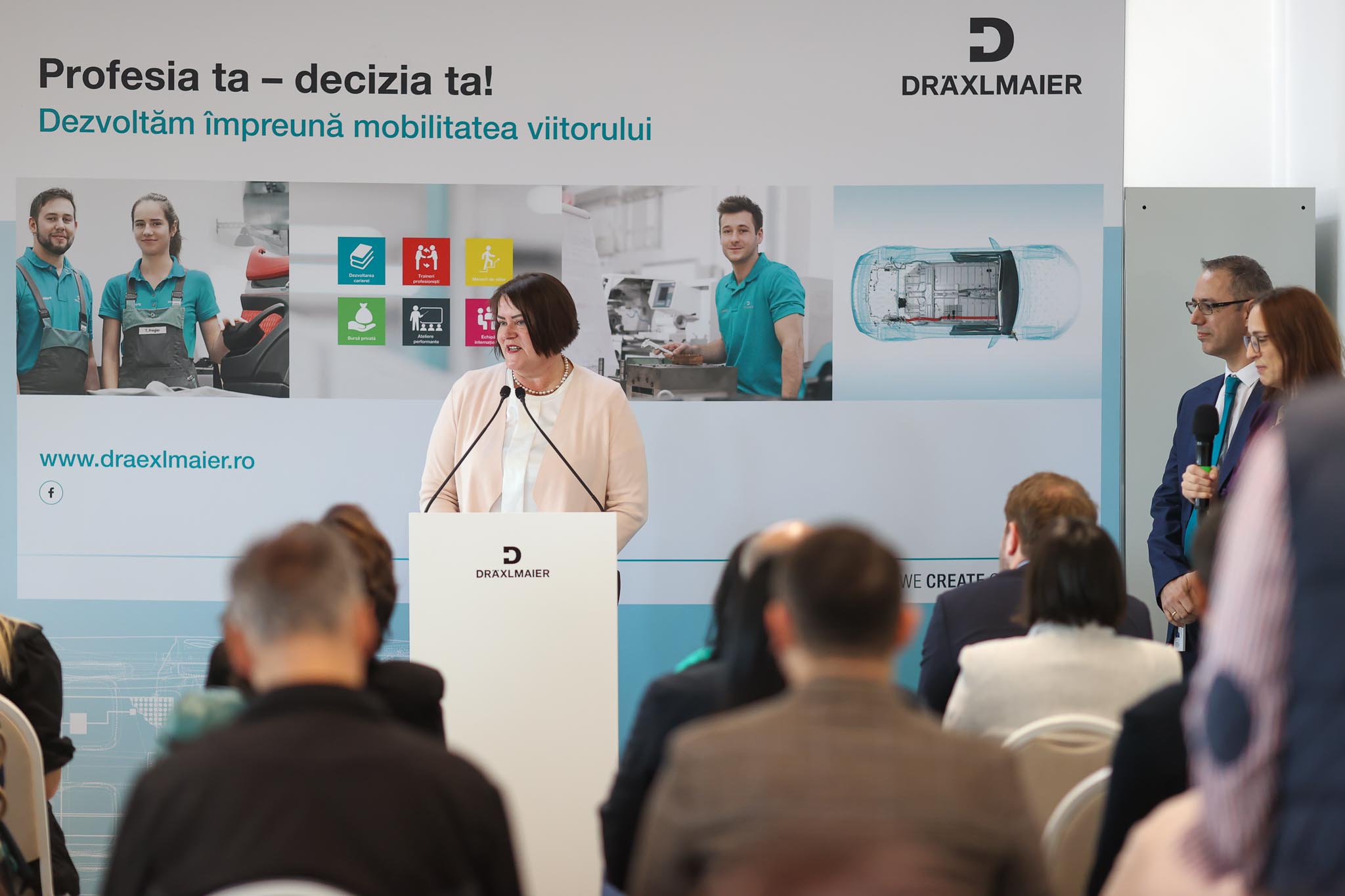 La eveniment a participat și Barbara Gerber, Coordonatorul Departamentului de Formare Profesională al DRÄXLMAIER Group. Ea a evidențiat importanța formării viitorilor profesioniști în cadrul companiei. ”Scopul nostru este să oferim elevilor care studiază alături de DRÄXLMAIER șansa unor programe care să le asigure cunoștințele și deprinderile necesare unei cariere. La Timișoara au toate condițiile să se dezvolte profesional. Ne-am implicat în dezvoltarea programului de școală profesională încă din 2014, de la prima inițiativă de acest tip în România și am pus bazele unor parteneriate puternice cu școlile și cu comunitățile locale”, a afirmat Barbara Gerber.