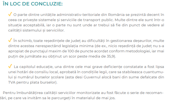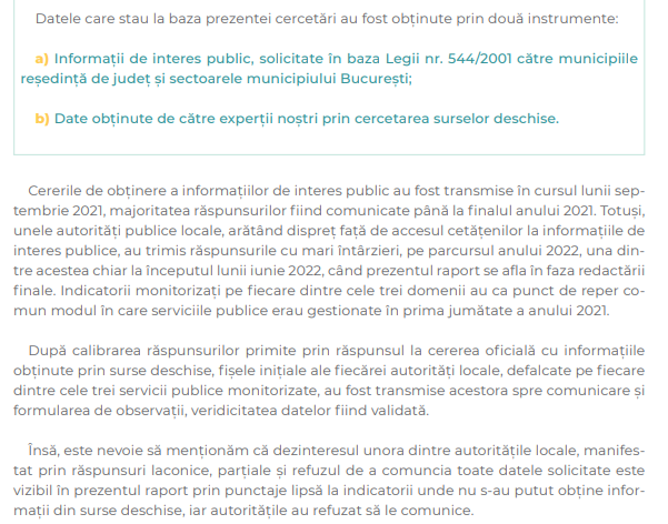 Studiul, realizat în premieră în România, oferă o viziune asupra serviciilor publice oferite cetățenilor, dar și recomandări specifice pentru îmbunătățirea calității acestora. Realizat în perioada septembrie 2021 – mai 2022, studiul a vizat 47 de UAT-uri (municipii reședință de județ și primăriile de sector din București).