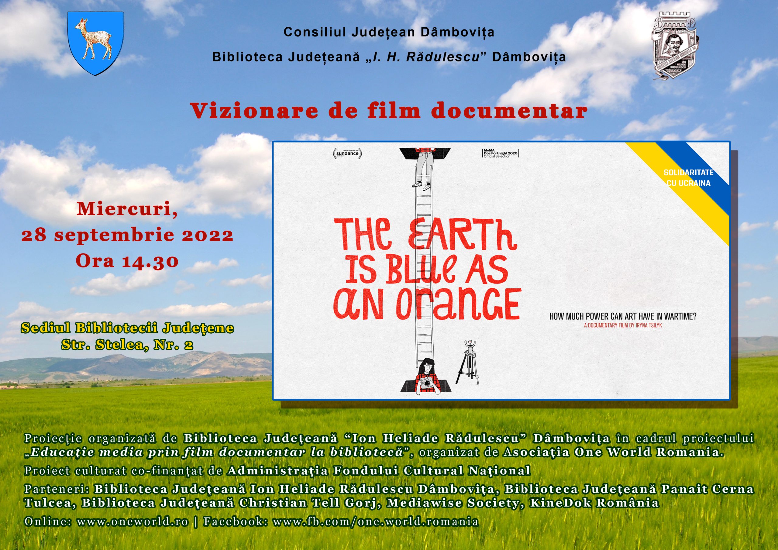 Miercuri, 28.09.2022, Biblioteca Judeţeană „Ion Heliade Rădulescu” Dâmboviţacontinuă seria de proiecţii de film documentar cu filmul ”Pământul este albastru ca o portocală/ The earthisblue as an orange”, care va fi proiectat la sala de conferinţe începând cu ora 14.30.