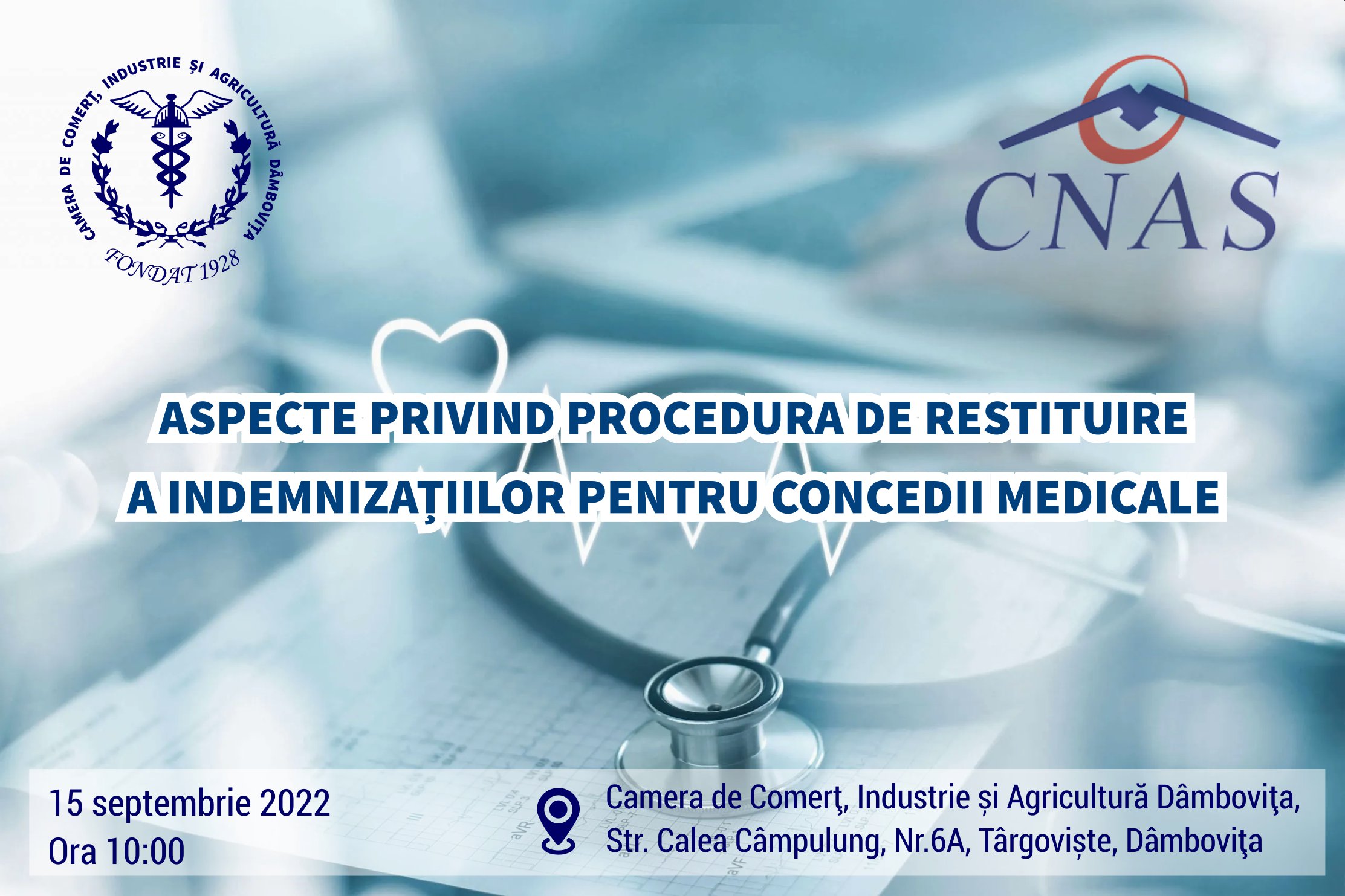Camera de Comerț, Industrie și Agricultură Dâmbovița și Casa Județeană de Asigurări de Sănătate Dâmbovița, organizează un seminar de informare cu tema: ASPECTE PRIVIND PROCEDURA DE RESTITUIRE A INDEMNIZAȚIILOR PENTRU CONCEDII MEDICALE.