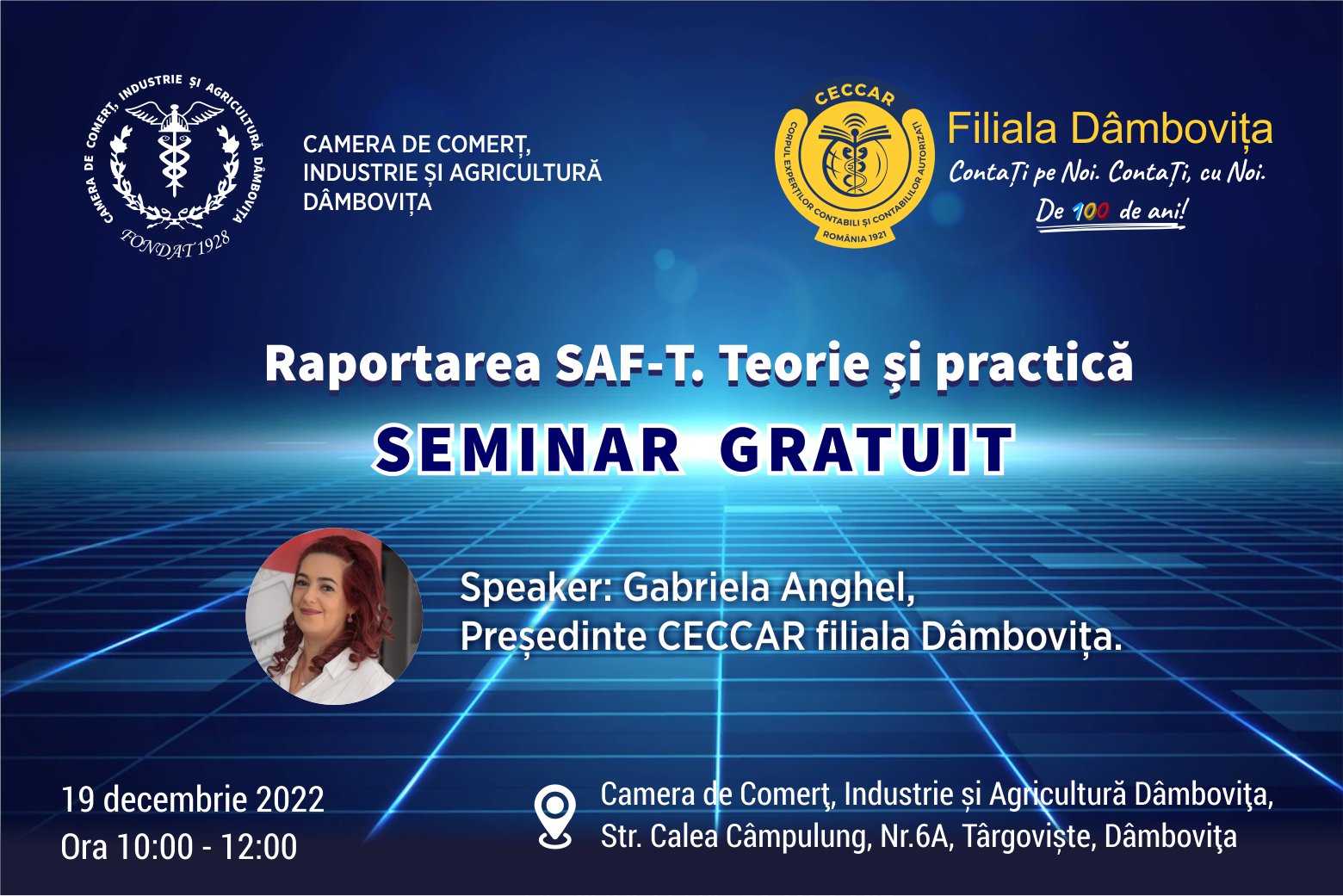 Camera de Comerț, Industrie și Agricultură Dâmbovița împreună cu CECCAR – Filiala Dâmbovița au organizat ieri, 19 decembrie 2022, la sediul din Calea Câmpulung, nr. 6A, seminarul gratuit cu tema „Raportarea SAF-T. Teorie și practică”. Evenimentul a fost susținut de doamna Gabriela Anghel – Președinte CECCAR – Filiala Dâmbovița, Expert Contabil.