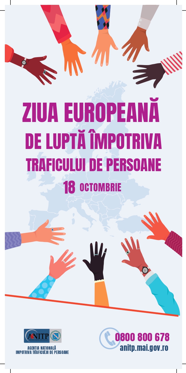 Agenţia Naţională Împotriva Traficului de Persoane (A.N.I.T.P.) și partenerii săi organizează în perioada 16 – 22 octombrie a.c., o serie de evenimente dedicate marcării Zilei Europene de Luptă Împotriva Traficului de Persoane – 18 octombrie, incluse în cadrul campaniei de informare şi prevenire “Săptămâna prevenirii traficului de persoane”.