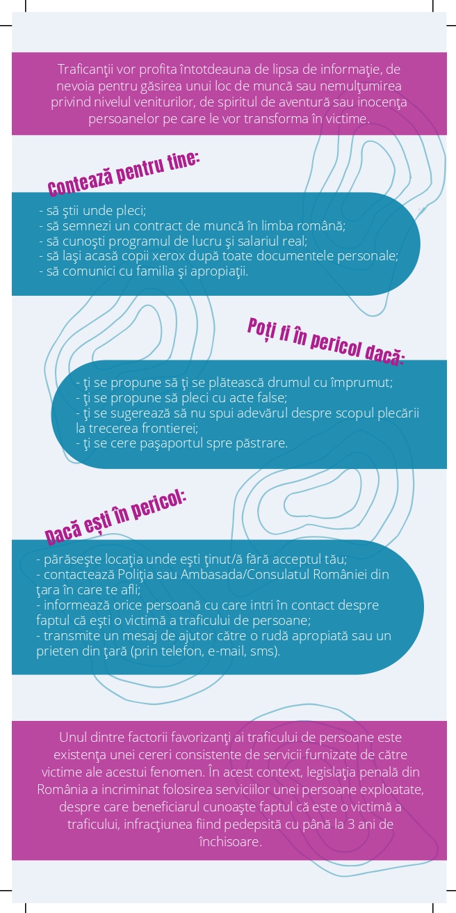 Totodată pe canalele de social media ale instituției și ale partenerilor vor fi promovate mesaje relevante menite să facă cunoscut fenomenul traficului de persoane și să contribuie la o mai bună protecție a cetățenilor.
