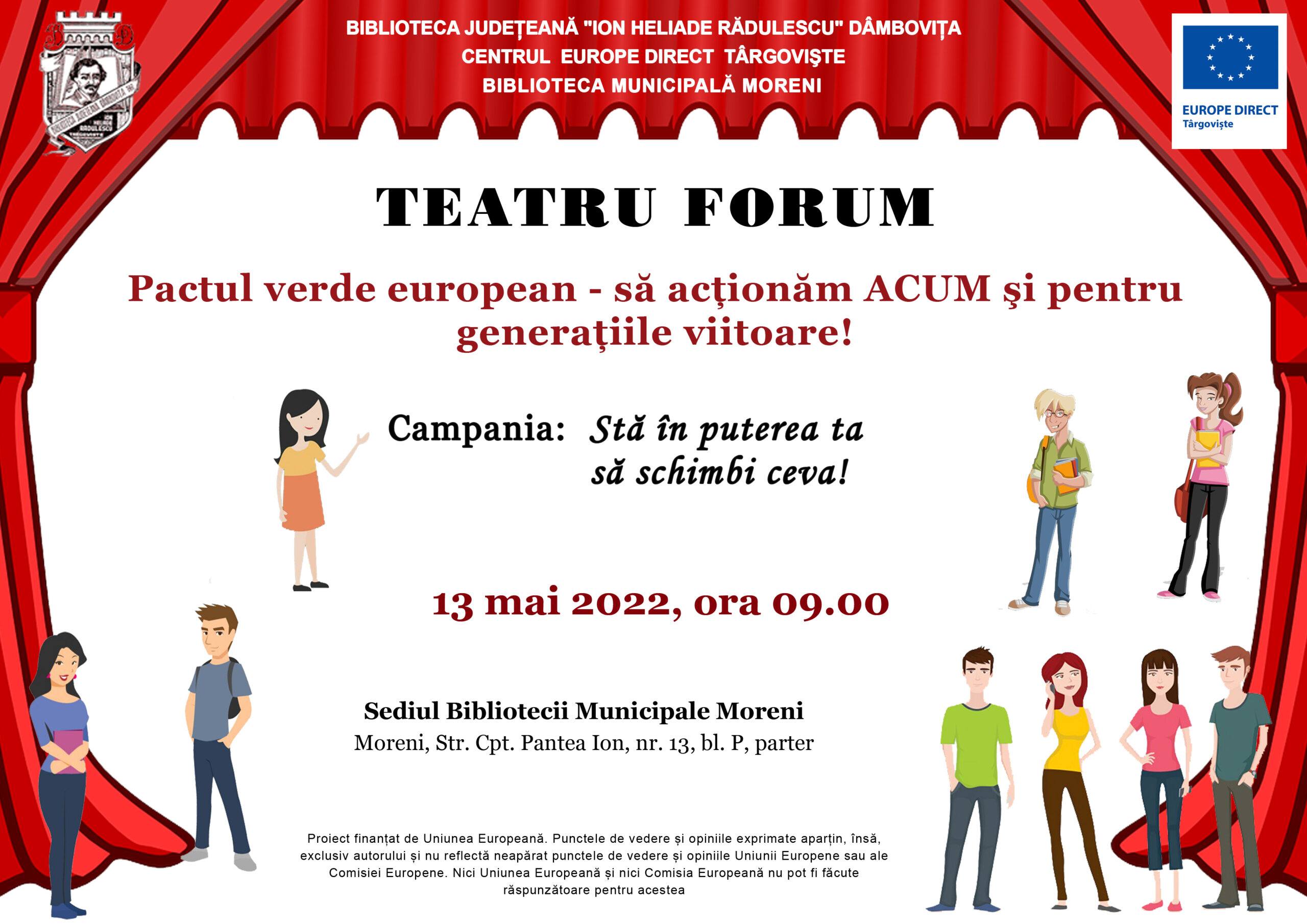 Centrul EUROPE DIRECT Târgovişte are plăcerea să vă invite vineri, 13 mai 2022, începând cu ora 09.00 la evenimentele ce se vor desfăşura în cadrul – Sarcina nr. 4 din Planul de comunicare anual pentru 2021 – UE în școli, activitatea 4.1. Stă în puterea ta să schimbi ceva!, prilej cu care va avea loc o reprezentație de teatru forum cu tema Pactul verde european – să acționăm acum și pentru generațiile viitoare! susținută de voluntari (actori amatori) ai centrului mai sus menţionat, coordonați de membrii echipei.