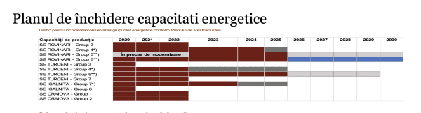 Planul de restructurare actualizat, transmis către Direcția Competitivitate din cadrul Comisiei Europene, prevede decalarea termenelor de închidere a unităților pe cărbune până la finalul anului 2029. Potrivit propunerilor, la nivelul Complexului Energetic Oltenia vor continua să funcționeze cinci exploatări miniere, necesare pentru alimentarea capacităților de producție pe bază de lignit, inclusiv pentru Electrocentrale Craiova.