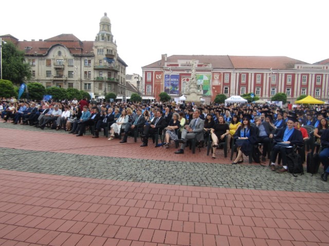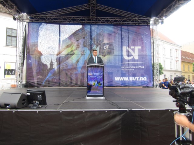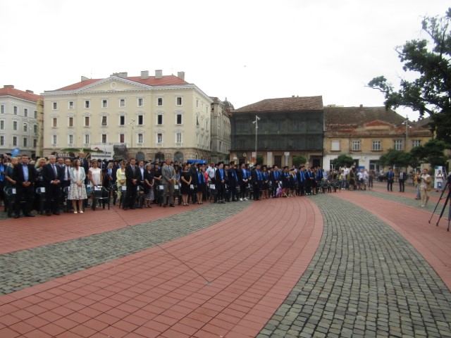 Peste 2000 de absolvenți s-au adunat în Piața Libertății cu păstrarea regulilor de distanțare socială, alături de conducerea UVT, reprezentată de rectorul UVT, Prof.Univ.Dr. Marilen Gabriel Pirtea și de prorectorii instituției, decanii și prodecanii facultăților, de liderii organizațiilor studențești, managerii departamentali din universitate, cât și de invitații speciali și partenerii instituționali ai UVT.