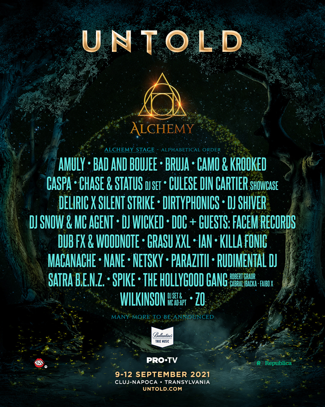 UNTOLD găzduiește în fiecare an în România artiști și DJ-i de renume din toată lumea, pe toate scenele festivalului și reprezintă cu succes genuri muzicale din diverse stiluri, de la trupe live la seturi de excepție electronice, EDM, techno, tech-house, house, deep house, drum&bass, dubstep, grime, trip-hop, trance, tribale, pop, hip-hop, rock sau reggae și nu numai. Creatorii unuia dintre cele mai mari festivaluri din Europa aduc și în 2021 nume reprezentative pentru genurile underground. Charlotte de Witte, Claptone, Seth Troxler, Caspa, Cellini, Colyn, DJ Snow & MC Agent, DJ Shiver și mulți alții urcă între 9 și 12 septembrie pe scenele Alchemy și Galaxy și completează astfel line-up-ul excepțional pentru cea de-a șasea ediție UNTOLD.