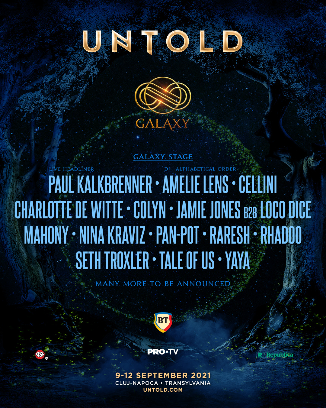 Pe scena Galaxy vor fi prezenți și Cellini, belgianul care se joacă cu un amestec de deep și house, precum și Yaya, DJ-ul canadian care a adus în producțiile proprii și în DJ set-uri elemente din muzica africană. În acest an, în liga Galaxy de la UNTOLD mixează Paul Kalkbrenner Live, Amelie Lens, Jamie Jones B2B Loco Dice, Nina Kraviz, Pan-Pot, Raresh, Rhadoo și Tale of Us.