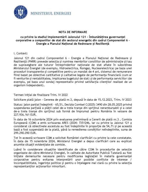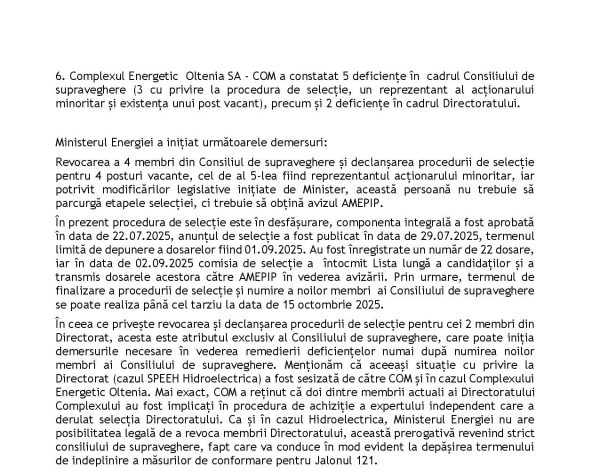 ”Ministerul Energiei, în calitate de acționar majoritar a SPEEH Hidroelectrica, respectiv Complexul Energetic Oltenia, nu deține instrumente legale pentru a putea obliga Consiliul de Supraveghere să revoce membrii Directoratului evidențiați în decizia COM. Menționăm că revocarea acestora fără justă cauză ar obliga Hidroelectrica la plata unor daune interese de aprox. 5 milioane lei (în context, calculul preliminar efectuat de experții MIPE indică o penalitate de minimum 25 milioane EUR pentru neîndeplinirea condițiilor aferente selecției Directoratului celor 2 companii – 4 persoane); – Orice acțiuni ar fi putut fi luate în considerare de către Ministerul Energiei (modificare Act Constitutiv) ar fi fost lipsite de efecte juridice, în considerarea faptului că membrii respectivi au contracte de mandat încheiate cu Consiliul de Supraveghere; – Constatarea faptului că membrii Consiliului de Supraveghere a SPEEH Hidroelectrica nu au dat eficiență Deciziei Comisiei, care impunea reluarea unei proceduri de selecție transparente și competitive pentru Directorat în termen de 6 luni (până la 28 noiembrie 13 2025).