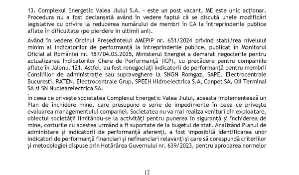 La Complexul Energetic Valea Jiului S.A. este un post vacant, iar ME este unic acționar.