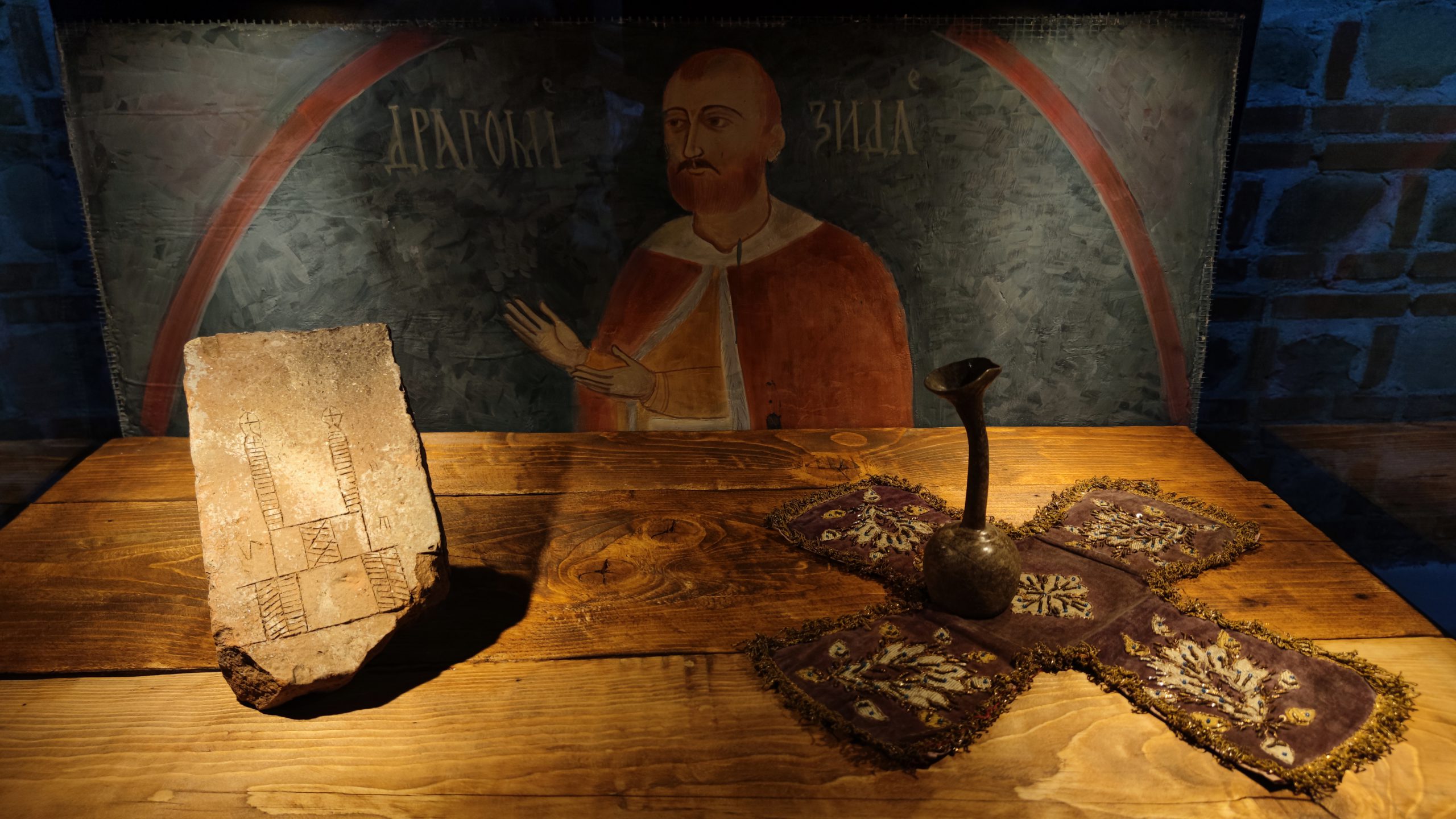Ineditul constă în identificarea, pe cale arheologică, a unui complex ecleziastic medieval, necunoscut până astăzi, deci fără mențiuni documentare care să-i semnaleze prezența. Piesele selectate pentru expunere au fost încadrate cronologic, în intervalul secolelor XVI-XVII și sunt reprezentative pentru a ilustra contextul arheologic : o cărămidă inscripționată cu planul unei clădiri și un lacrimariu, ambele descoperite în anul 2020, în punctul Calea Domnească, nr. 192, în imediata vecinătate a fostei Curți Domnești de la Târgoviște.