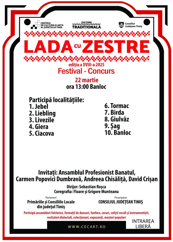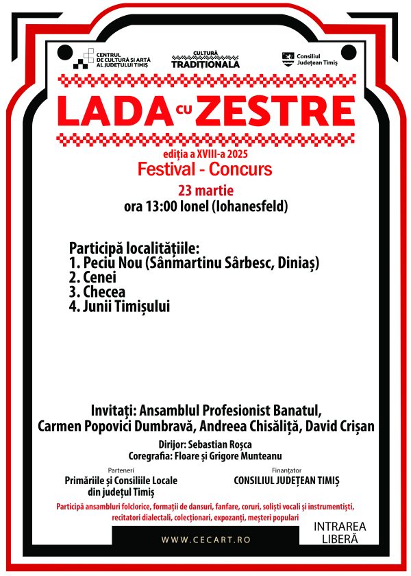 Județul Timiș recuperează și readuce în atenția publicului un patrimoniu cultural viu, sensibil și prețios la cea de-a XVIII-a ediție a Festivalului – Concurs ”Lada cu Zestre,” eveniment organizat de Centrul de Cultură și Artă al Județului Timiș, cu susținerea financiară a Consiliului Județean Timiș și în parteneriat cu primăriile și consiliile locale din județ. În acest an, 54 de localități din județul Timiș s-au înscris în competiția pentru marele premiu.