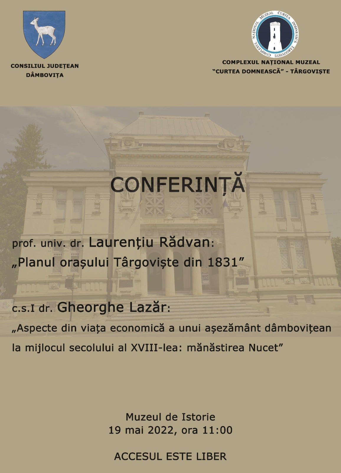 În preambulul Zilelor Județului Dâmbovița, 1 – 5 iunie 2022, Consiliul Județean Dâmbovița, prin Complexul Național Muzeal „Curtea Domnească” Târgoviște, invită mediul academic dâmbovițean, studenții Universității „Valahia”, alături de toți cei interesați, la susținerea a două conferințe despre istoria județului nostru.