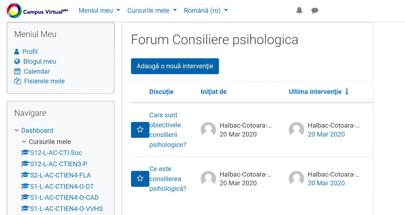 În acest sens, psihologii CCOC stau la dispoziția studenților care simt că au nevoie de consiliere atât pentru situația descrisă mai sus, cât și în general pentru diverse probleme cu care se confruntă în viața de zi cu zi și pentru care au nevoie de un sfat, sau de sprijin pentru a trece cu bine peste acestea –  serviciul fiind asigurat cu sprijinul Centrului de e-Learning, care gestionează platforma Campus Virtual (cv.upt.ro).