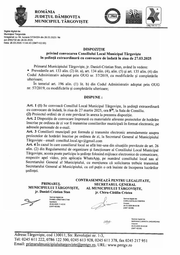 • Consiliul Local Municipal Târgoviște, ședință extraordinară în data de 27 martie 2025