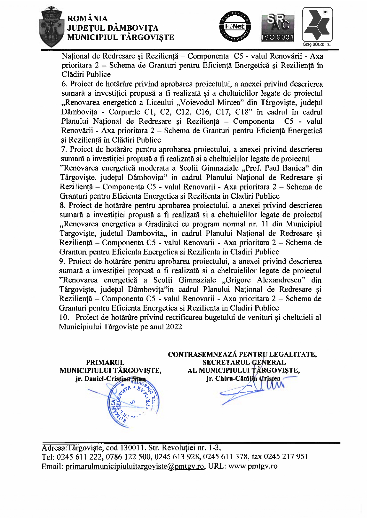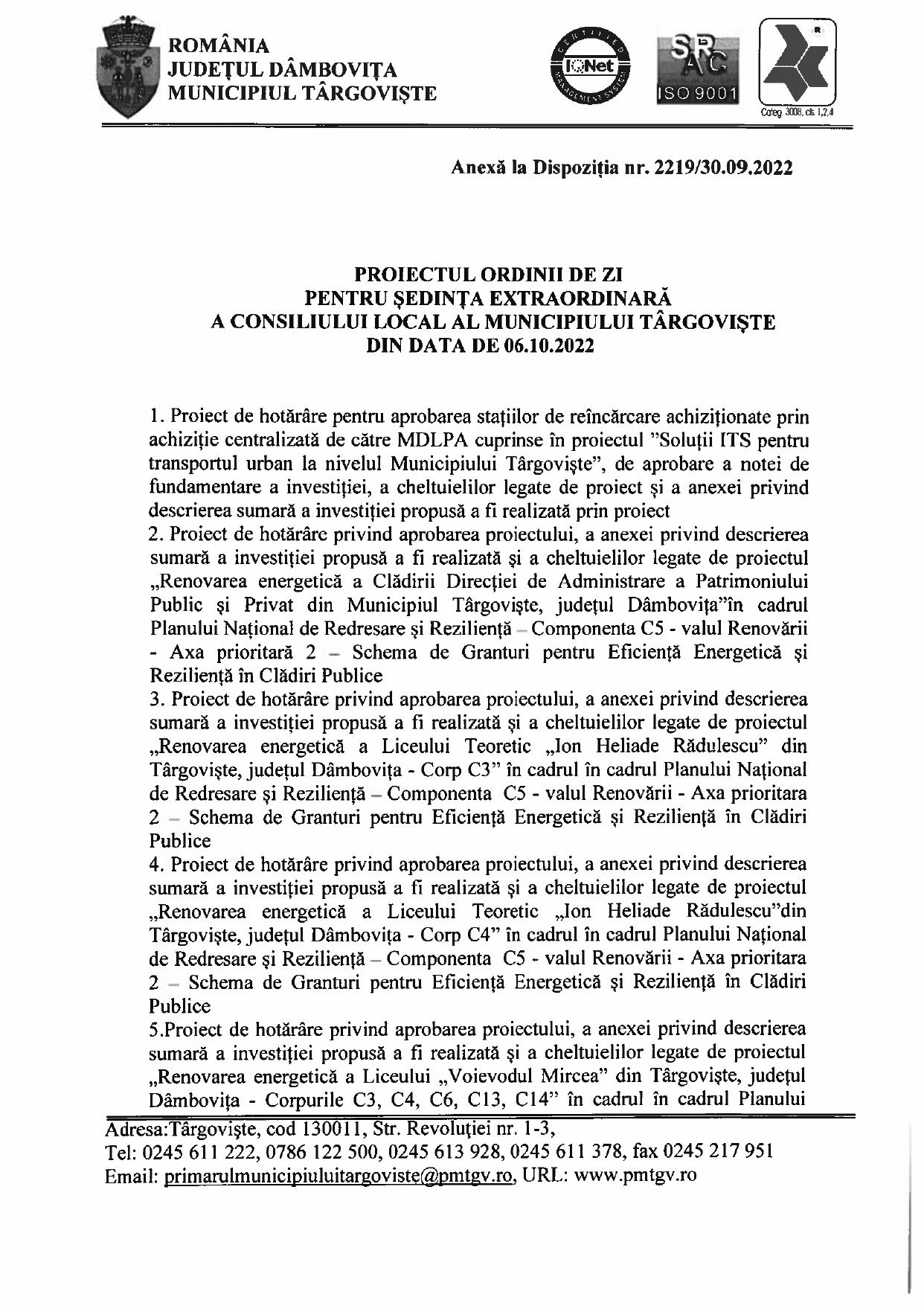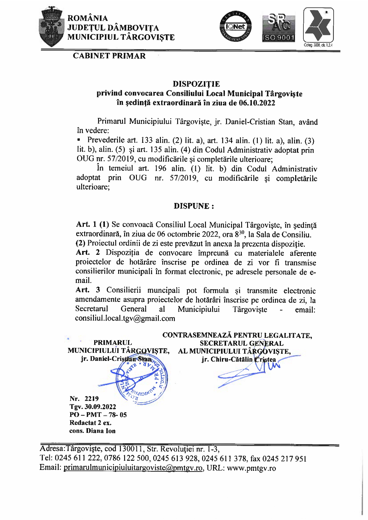 ȘEDINȚA EXTRAORDINARĂ convocată de către Primarul Municipiului Târgoviște în data de 06.10.2022, ora 08.30, în Sala de Consiliu. Comisiile sunt programate în ședință reunită în aceeași zi, la ora 08.15.