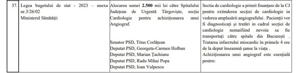 Corneliu Ștefan, președintele Consiliului Județean Dâmbovița, i-a felicitat astăzi pe parlamentarii PSD Dâmbovița pentru amendamentul depus și aprobat, prin care, din bugetul național pe anul 2023, mai exact 2,5 milioane de lei vor merge către Spitalul Județean de Urgență din Târgoviște, secția de Cardiologie, pentru achiziționarea unui angiograf.