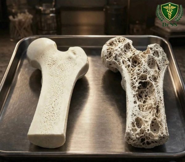 - Osul osteoporotic (dreapta): Apare fragil, poros și sever deteriorat. Este o structură vulnerabilă, unde riscul de fractură este prezent chiar și la traumatisme minime sau mișcări obișnuite.