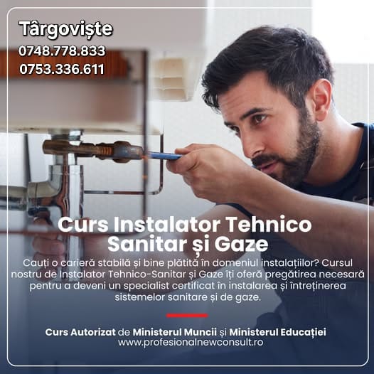 Curs INSTALATOR INSTALATII TEHNICO-SANITARE SI DE GAZE in Târgoviște. Vrei să inveti bazele unei meserii care se cauta mereu? Acum este momentul! Înscrie-te acumsi prinde un loc la Cursul Acreditat de Instalator instalatii tehnico-sanitare si de gaze la Profesional New Consult, unde teoria prinde viață în practică, si prinde un loc la urmatoarea grupa! Dobândești cunoștințe solide și deprinderi aplicate, pregătindu-te pentru succes!!!