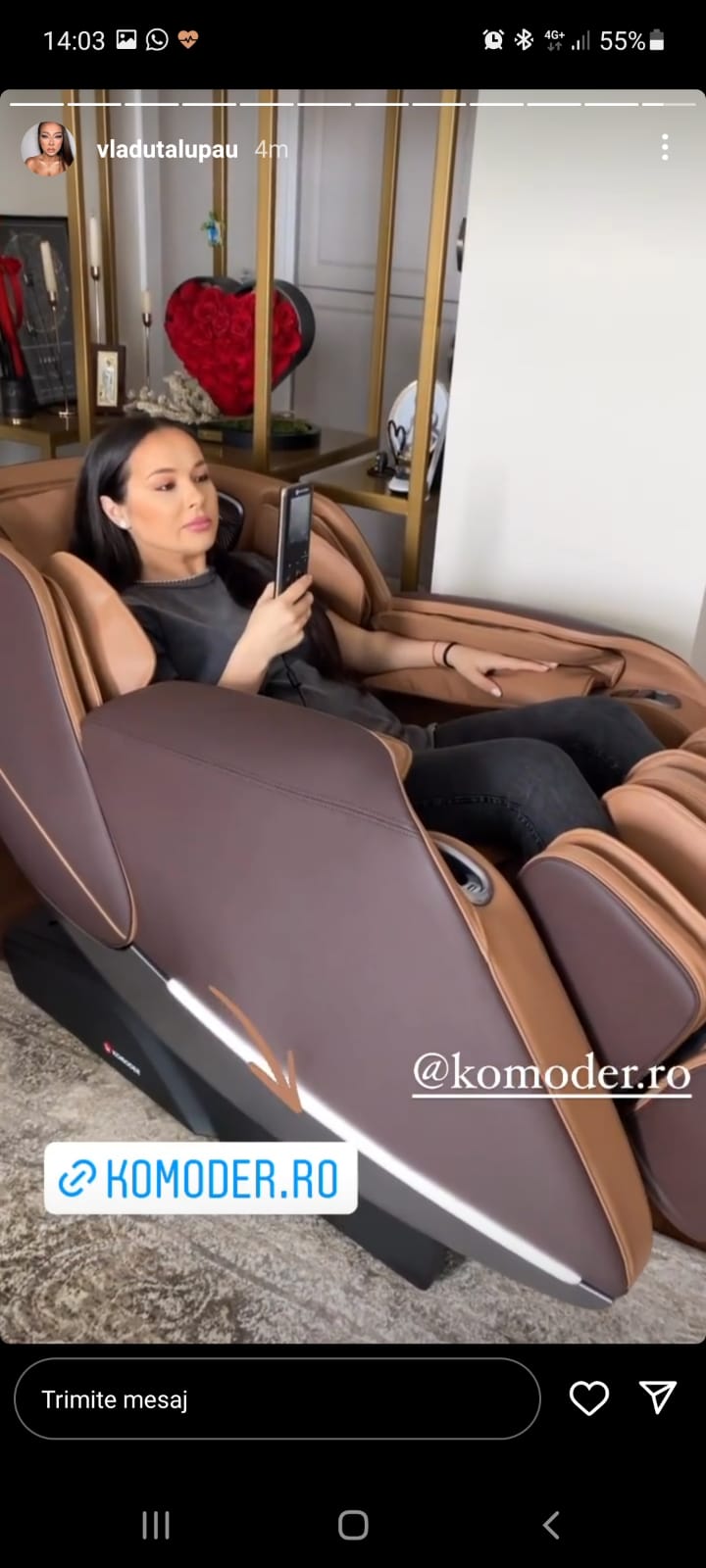 Vladuță Lupău: “Fiind o persoană care circulă foarte mult cu mașina am nevoie când ajung acasă că cineva să-mi facă masaj, așa că cel mai simplu este să ai fără nicio programare pe cineva acasă. Fotoliul Komoder mi-aduce beneficii de relaxare și medicale pentru că mă simt mult mai relaxată și revigorată. Designul îmi place foarte mult, ocupă puțin spațiu, are multe programe și are comenzi vocale și poți să-ți pui muzică. Pot să dorm mult mai bine după un masaj”.