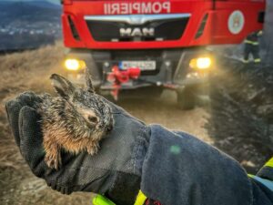 În ziua de 25 martie a.c., pompierii de la Detașamentul Târgoviște au intervenit, ca urmare a unui apel de urgență, pentru stingerea unui incendiu de vegetație uscată în comuna Răzvad, sat Gorgota. În timp ce acționau pentru stingerea focului, un pompier a văzut un iepuraș (pui), ud de la apa pompierilor care l-a salvat de focul care-l înconjura. Era împietrit de frică și nu a fugit atunci când a fost luat de către colegul nostru, Albert Purice. După ce flăcările au fost stinse, iepurașul a fost adoptat de un coleg. Fiind așa mic nu putea supraviețui singur în mediul în care a fost găsit. Este momentul acela în care te bucuri că efortul tau a salvat o viață. Astăzi, poate au fost mai multe și nu ne dorim altceva decât să înceteze această iresponsabilitate a unora dintre concetățenii noștri. Din cauza vitezei cu care se propagă acest tip de arderi, multe animale pier nevinovate.