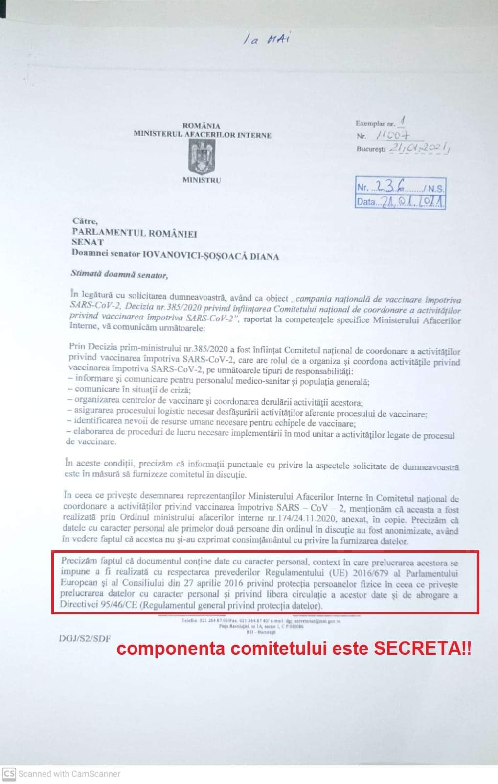 Iar Ministerul Afacerilor Interne a spus negru pe alb că este SECRETĂ componența acestui Comitet. Eu am văzut numele membrilor și vă pot spune doar că NU sunt profesioniști, NU au nici o legătură cu epidemiologia, virusologia, sau medicina în general.