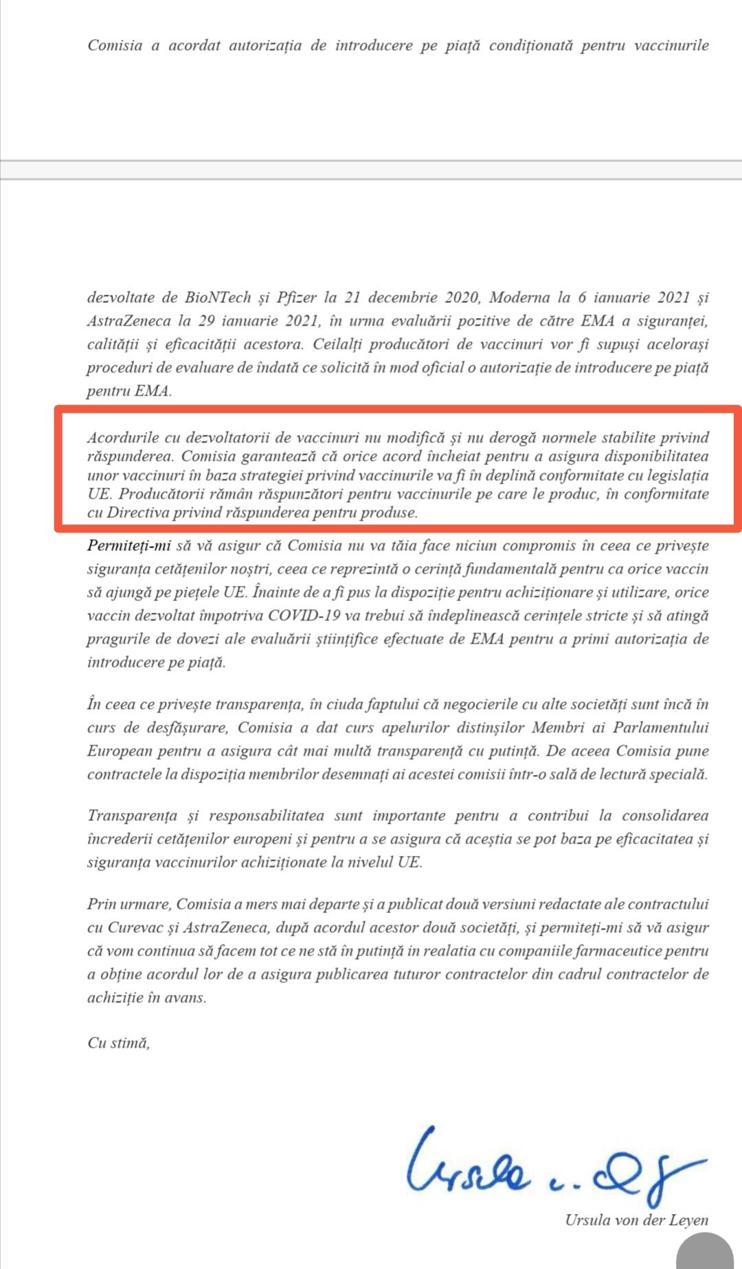 - La polul opus, Președinta Comisiei Europene, Ursula von der Leyen, i-a răspuns personal doamnei europarlamentar Maria Grapini asigurând-o de faptul că FIRMELE PRODUCĂTOARE DE VACCINURI POT FI TRASE LA RĂSPUNDERE.