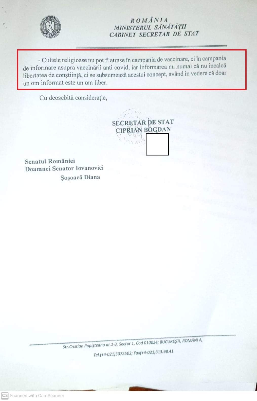 Deci, raspunsul primit de la secretarul de stat este unul fals, întrucât Biserica Ortodoxă Română a fost implicată de către Guvernul României într-o campanie de informare UNILATERALĂ, prezentând doar argumentele guvernului, cum că vaccinul ar fi unul sigur, astfel oamenii NU au fost informați cu privire la efectele adverse ale vaccinului.