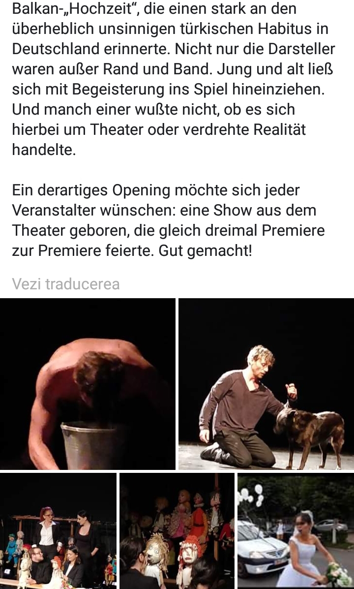 Oleg Eremin mixed with doll and drama version with „this day” in the studio. Kiril Vitoptov celebrated an outdoor triumph with the real grotesque of a Balkan „wedding”, which strongly reminded one of the arrogant nonsensical Turkish habitus in Germany. Not only the actors were out of whack. Young and old were involved in the game with enthusiasm. And many did not know if this was theater or twisted reality.