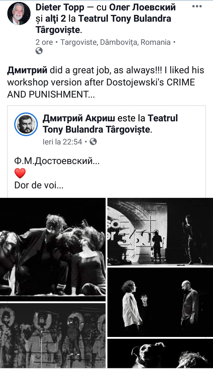 Oleg Loevsky, who organized numerous theatrical laboratories and most recently arrived at the Masterskaya Theater in St. Petersburg, brought Oleg Eremin, Kiril Vitoptov and Dimitru Acris, whom I valued, to Romania in the former capital of Wallachia. There, the three did a great job with the local performers.