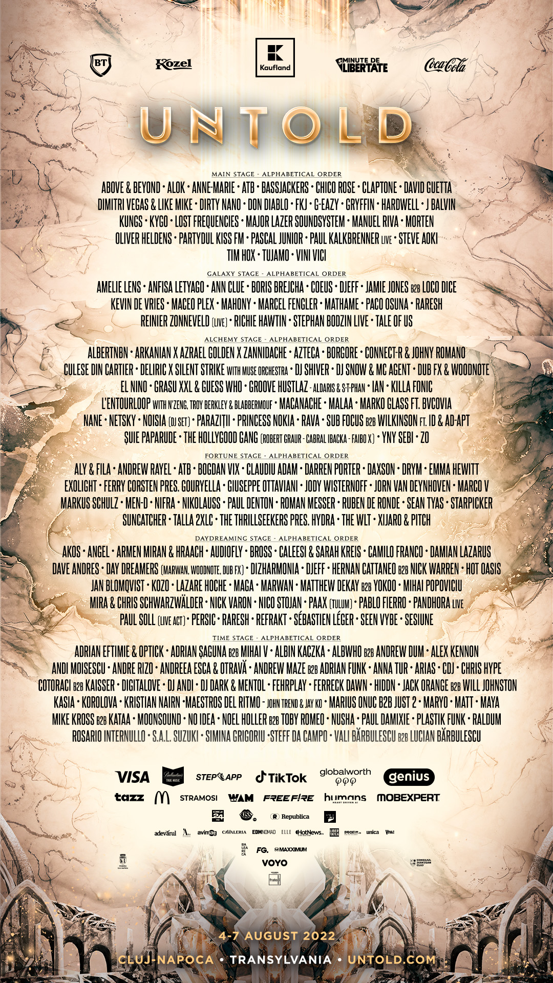Dimitri Vegas & Like Mike, îndrăgiți pentru show-urile lor pline de energie și pentru celebrul crowd control, revin pe Cluj Arena, unde se simt ca acasă, cu cele mai noi mixuri și piese proprii. Unul dintre cei mai longevivi artiști de muzică trance, DJ-ul și producătorul german ATB revine pe scena principală a festivalului UNTOLD, acolo unde a urcat pentru prima dată la ediția de debut a festivalului, în 2015. Line-up-ul scenei principale de la UNTOLD este întregit și de DJ-ul francez Kungs, cunoscut pentru mixurile sale cu influențe disco.
