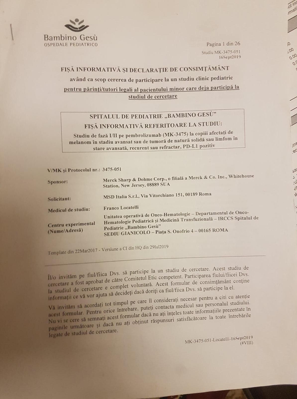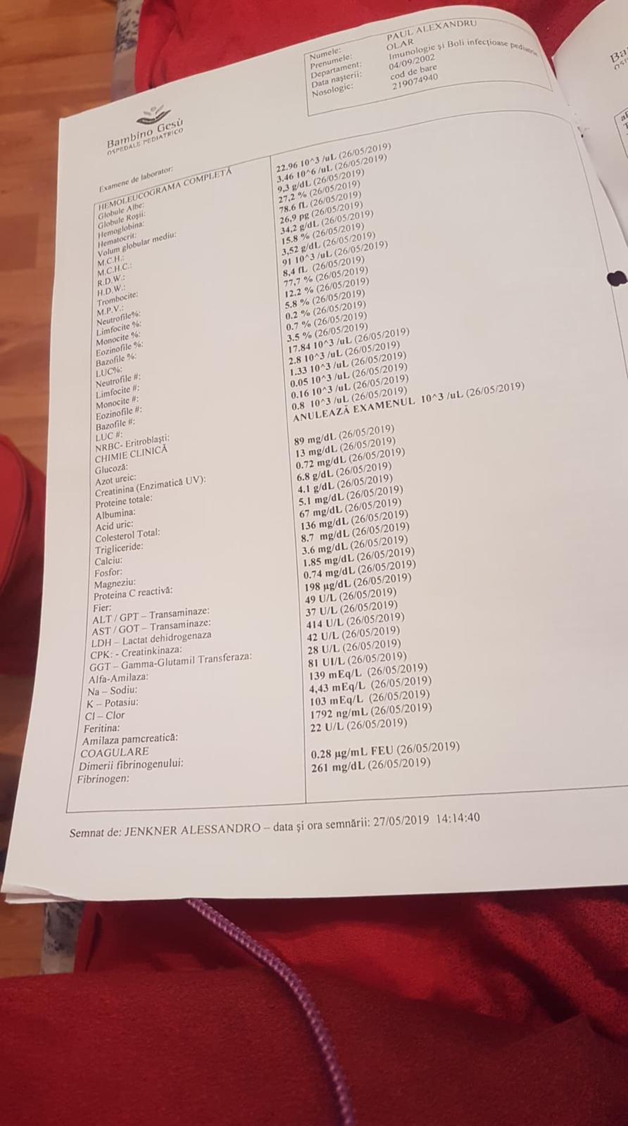 Acum suntem tot la spitalul Bambino Gesu dar din pacate tratamentul efectuat nu a dat rezultatele mult asteptate adica remisia bolii pentru a putea face acel autotransplant si este nevoie sa incepem alt tratament de durata.Avem nevoie neaparata de sprijinul si ajutorul d voastra atat financiar cat si moral.