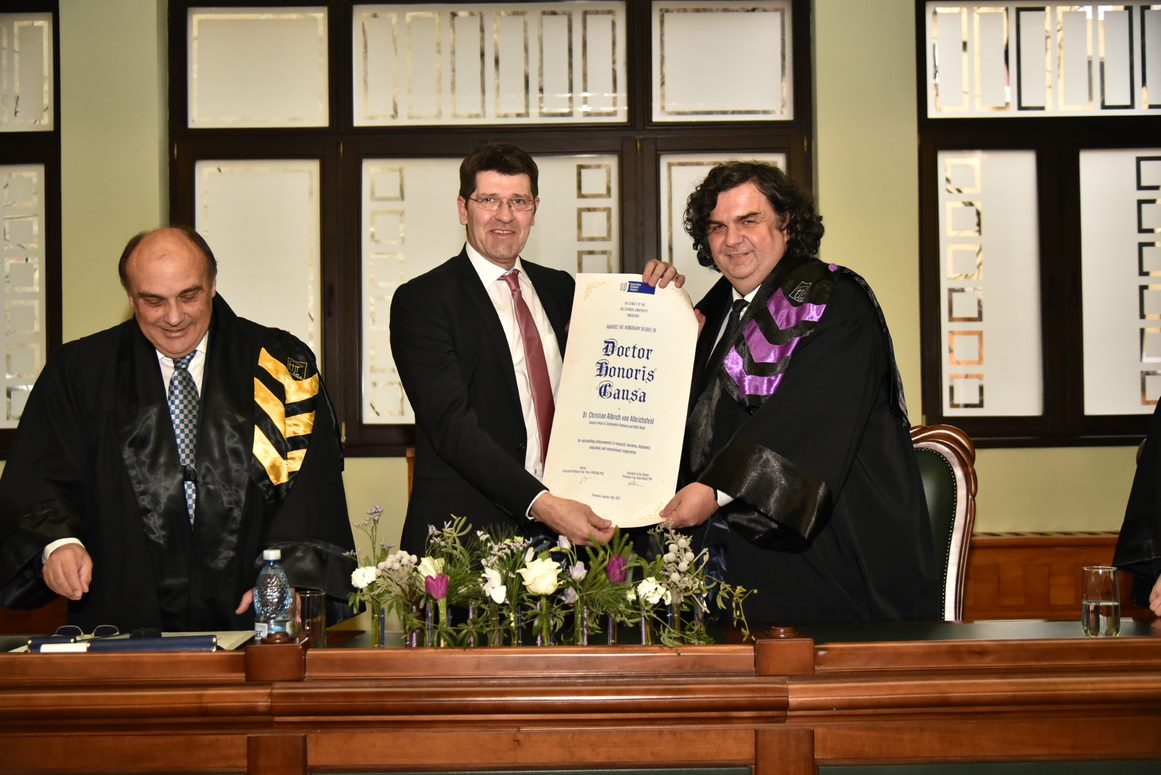 Senatul Universității Politehnica Timişoara s-a reunit joi, 26 ianuarie 2023, în ședință festivă în vederea decernării celei mai înlte distincții pe care o poate acorda o instituție de învățământ superior, titlul academic de Doctor Honoris Causa, domnului Christian Albrich von Albrichsfeld, Country Head of Continental Romania, pentru remarcabilele sale realizări în activitățile de cercetare, performanțe în mediul de afaceri, diplomație, educație și cooperare cu UPT.