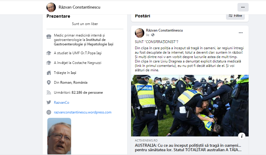 Medicul Răzvan Constantinescu a transmis, pe pagina de social media, un mesaj legat de măsurile luate în timpul pandemiei de covid 19, care nu mai au nicio legătură cu sănătatea, așa cum se vede cu ochiul liber, ci cu dictatura, cu un totalitarism și un control asupra populației.