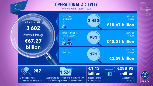 Rata de condamnare în cazurile EPPO este aproape de 95%, iar cu 275 de rechizitorii depuse anul trecut (cu 34% mai mult decât în 2024), EPPO aduce din ce în ce mai mulți autori de fraude UE în fața instanțelor naționale. Judecătorii au emis, de asemenea, ordine de înghețare a activelor în valoare de 1,13 miliarde EUR în investigațiile EPPO, în timp ce valoarea activelor efectiv înghețate în cursul anului s-a ridicat la 288,93 milioane EUR.