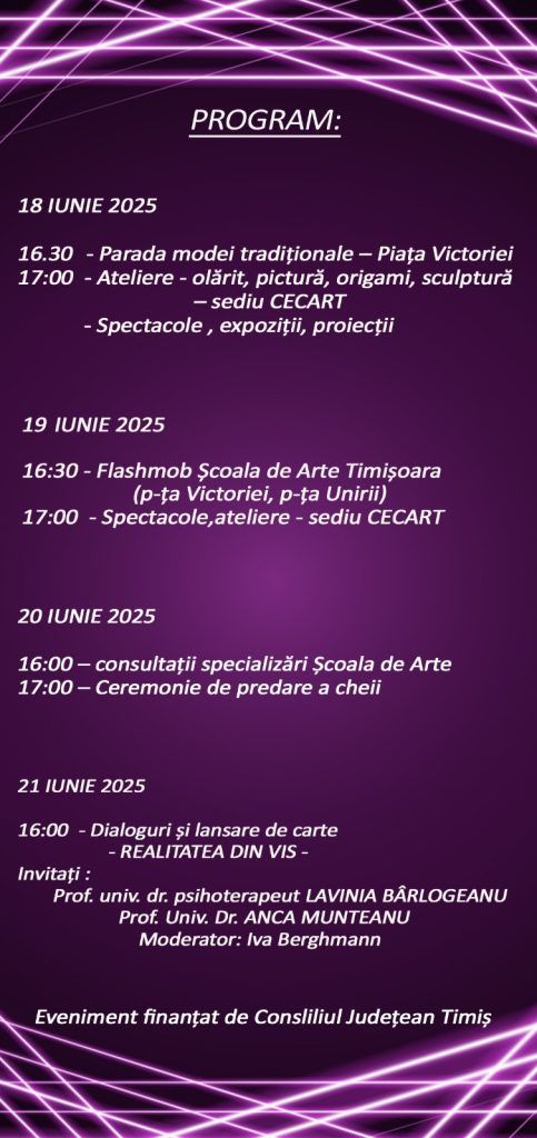 Festivalul Centrului de Cultură și Artă al Județului Timiș /Ziua Porților Deschise – Școala de Arte Timișoara se încheie cu un seminar de cultură și educație – ”Realitatea dn vis”, în 21 iunie 2025, ora17:00, la sala de spectacole a Centrului de Cultură și Artă al Județului Timiș, dedicat reflecției, dialogului intelectual și întâlnirii dintre artă, psihologie și spiritualitate.