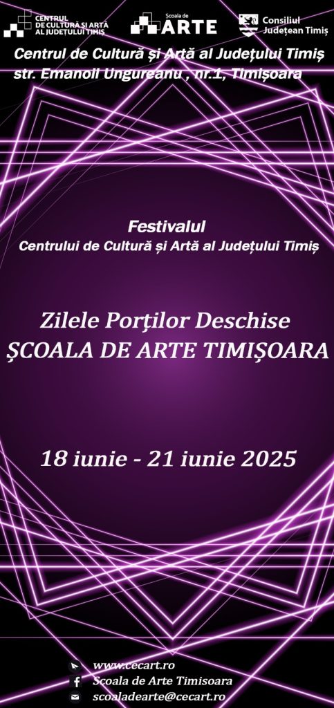 Centrul de Cultură și Artă al Județului Timiș are deosebita plăcere de a vă invita la Festivalul Centrului de Cultură și Artă al Județului Timiș – Zilele Porților Deschise – Școala de Arte Timișoara, care va avea loc în perioada 18 – 21 iunie 2025. Evenimentul, desfășurat sub egida Consiliului Județean Timiș, aduce în prim-plan arta, tradiția și educația culturală printr-o serie de activități interactive, spectacole și expoziții.