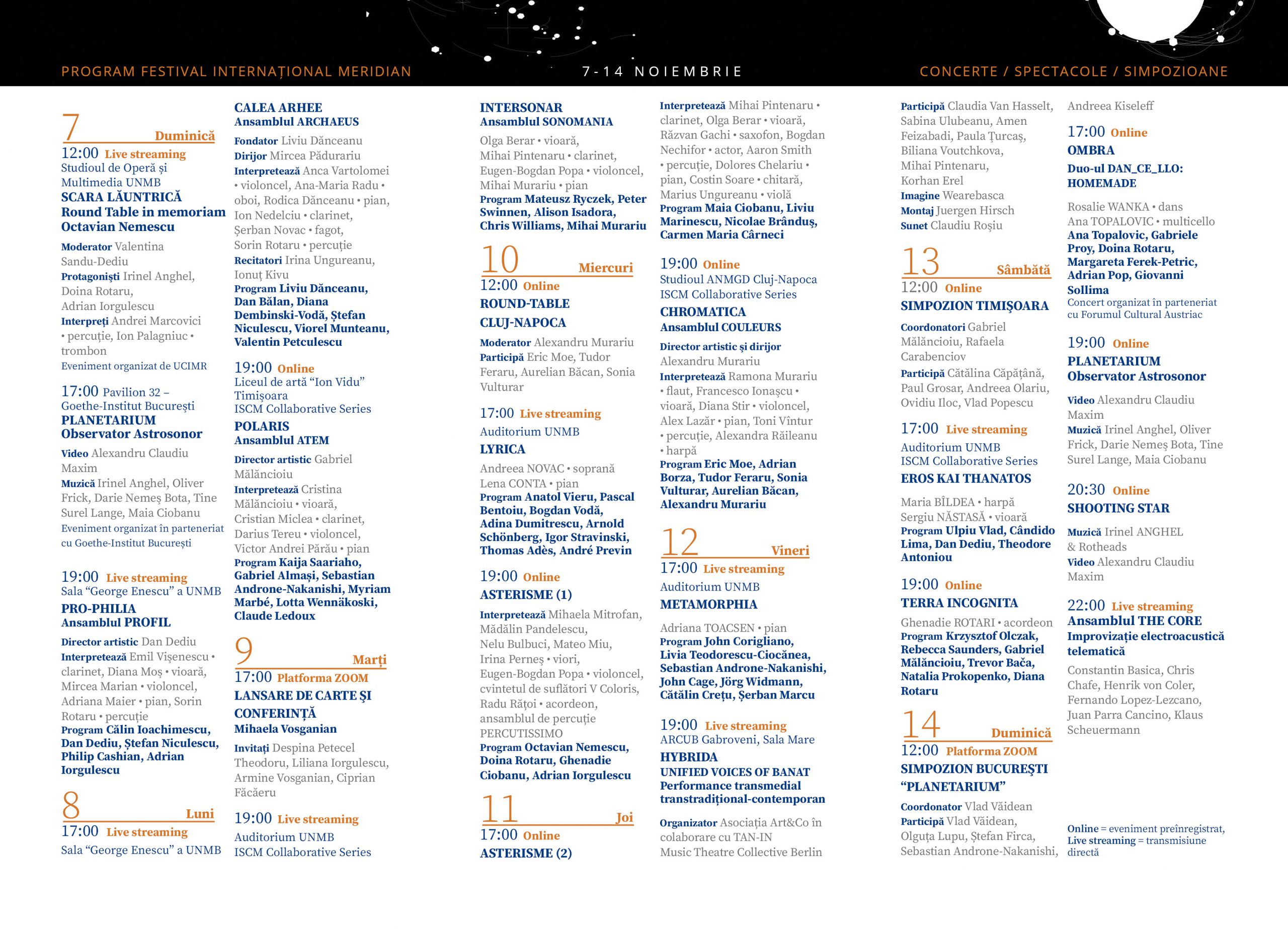 MERIDIAN – PLANETARIUM se va desfăşura la Bucureşti, Cluj-Napoca, Timişoara, dar într-un format adaptat la contextul actual al pandemiei: toate evenimentele vor fi transmise online, organizatorii păstrând posibilitatea de a avea public în sală pentru 6 concerte din Bucureşti, dacă normele sanitare vor permite acest lucru.